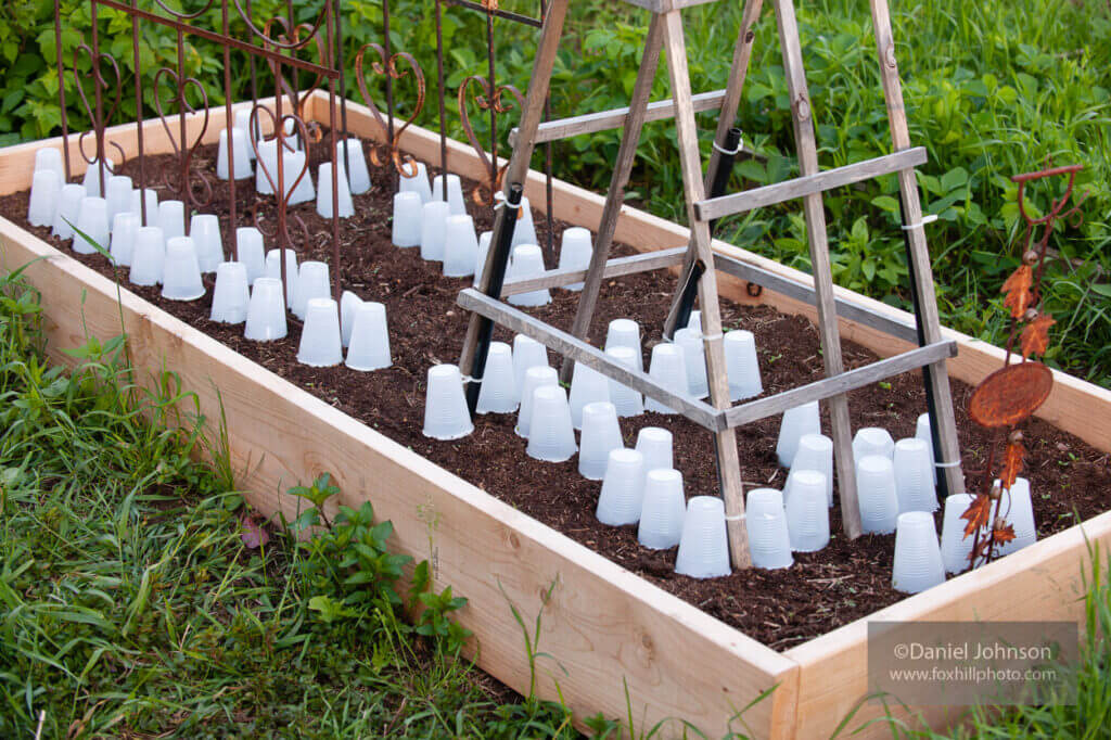 Small seedlings that are less than a few inches tall can be protected with any number of methods. The idea is to simply create air space between the delicate seedling and the harsh temperatures. Glass or plastic cloches are an obvious choice and work well, but you may not have enough of them. With the sun going down and the thermometer dropping, use whatever’s handy: buckets, empty pots, even small cardboard boxes. In a pinch, you can use drinking cups—keep a box of party-sized cups on hand in your shed or garage and you’ll have plenty to go around for individual seedlings year after year.