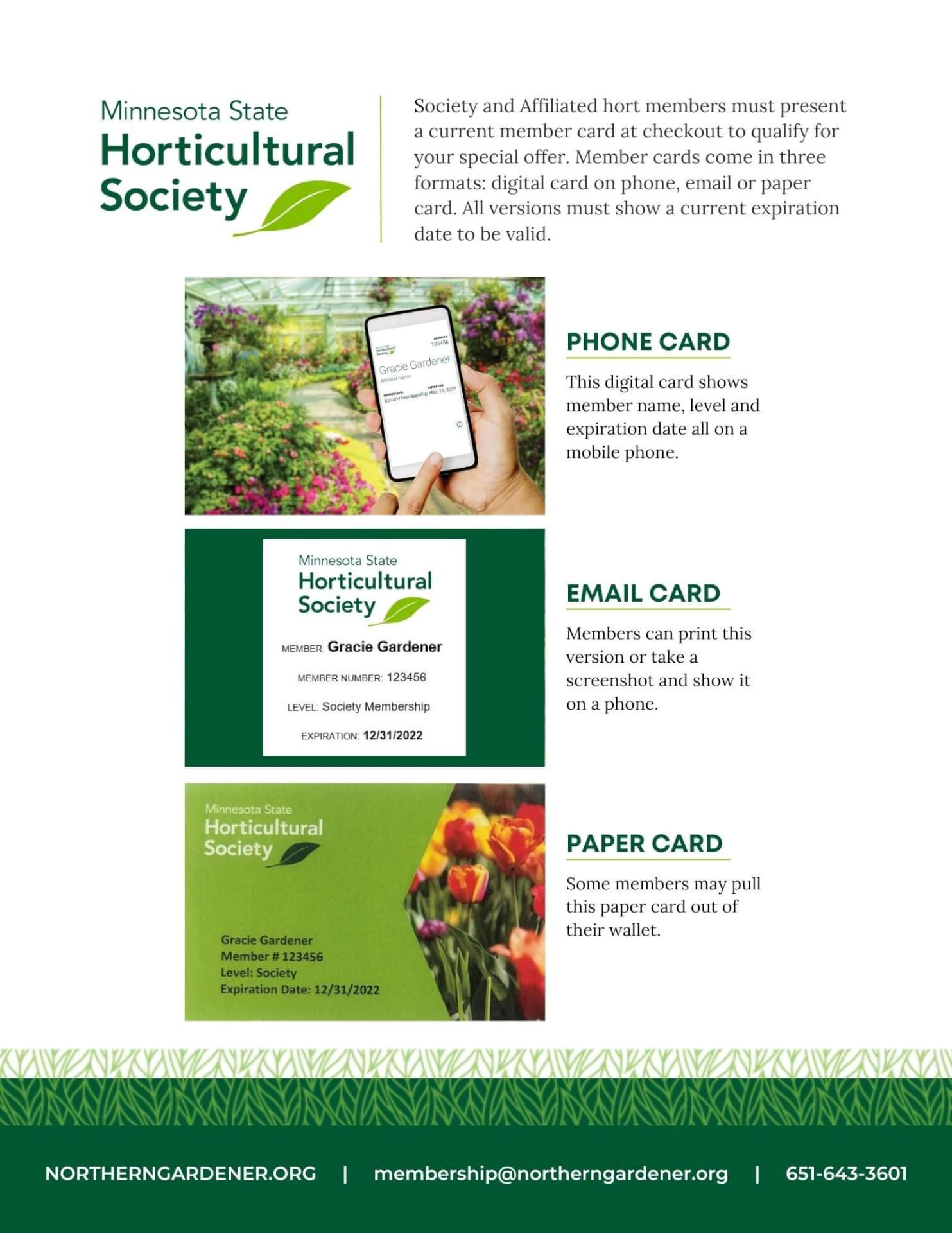 Member cards come in three formats: phone, email and print. Show your team samples so they know what to look for.