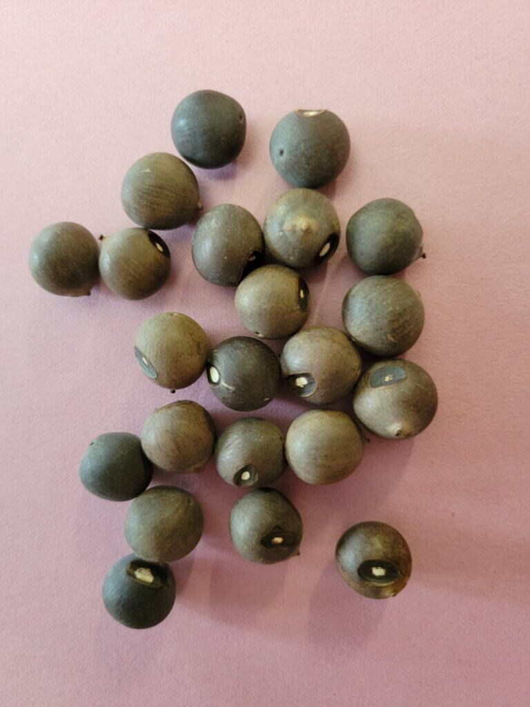 The seeds, twenty-two in my Christmas gift, look like smallish cap-less acorns. And they’re hard as rocks! Produced in a seed pod that looks like nothing other than a shower head, the seeds require “nicking” to jump-start their way to a growing plant.