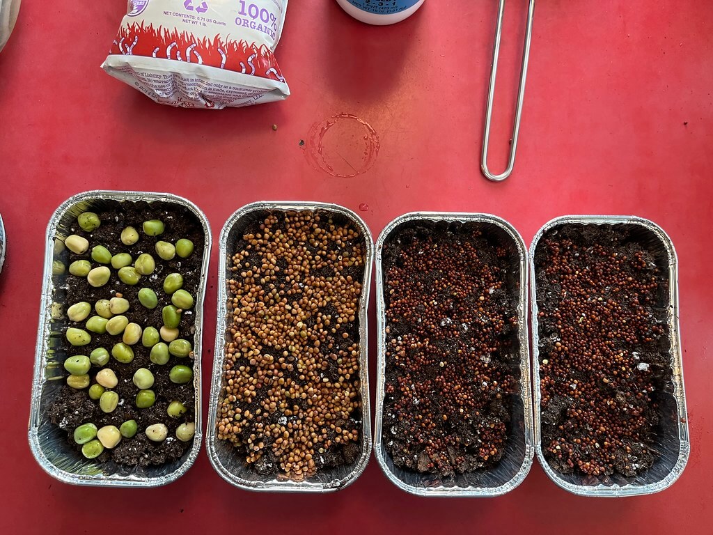 Gently press the seeds into the top of the soil. L to R: snap peas, radishes, and two pans of a brassica microgreen mix.