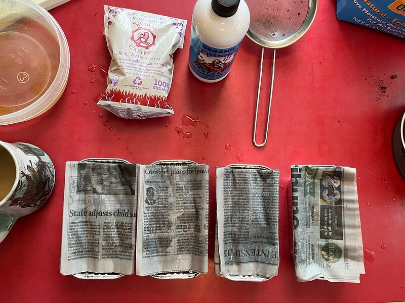 For each mini loaf pan you need about 1 teaspoon of smaller seeds such as broccoli or kale, and about 1 tablespoon of larger-size seeds such as radish or peas. The next morning, fold some newspapers into roughly the size and shape of your container. Soak them in water. Prepare your soil by moistening it in a bucket. This way you can ensure you have just the right amount of soil and water-moist but not wet.