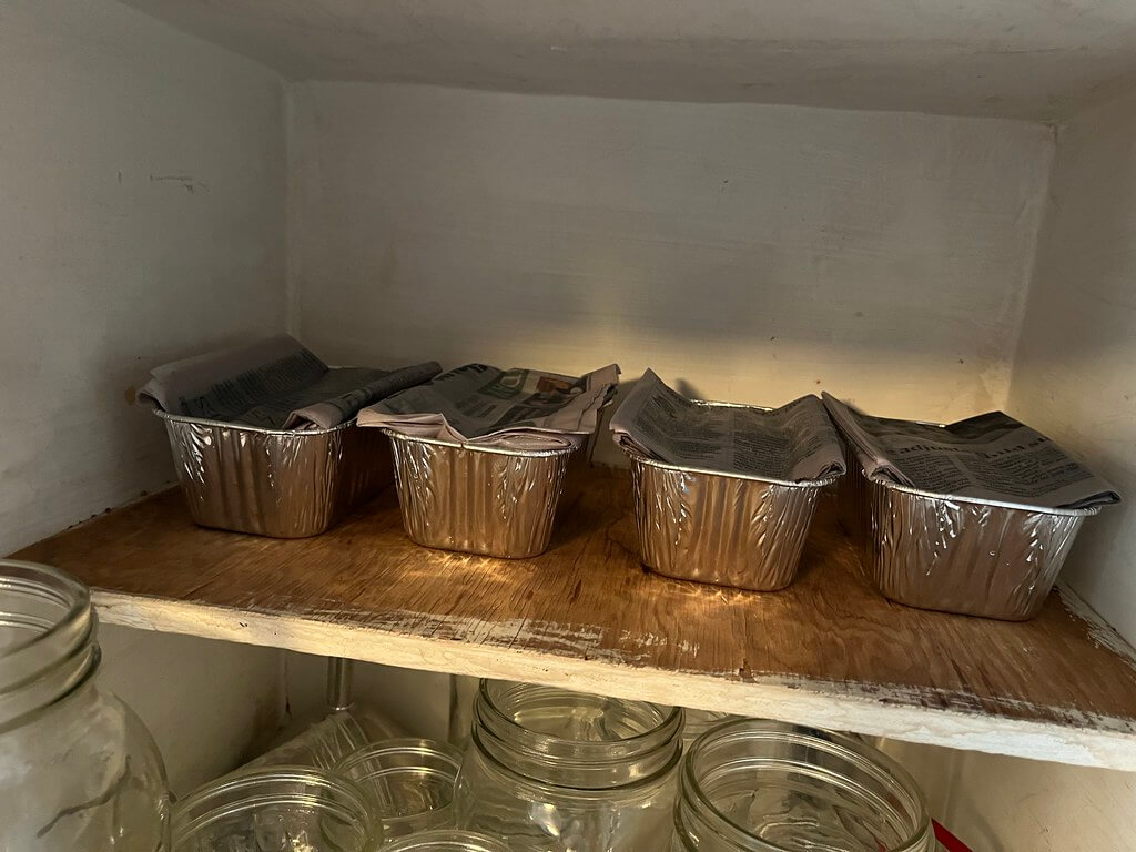 Place in a warm, dark place. I happen to have a cupboard that is adjacent to a furnace vent and stays quite toasty. Perfect. Now the waiting game begins-wait 4 days. It might take longer if your cupboard is cooler. But start checking in four days. The purpose of keeping them in the dark at first is to trick the seedlings into stretching out tall, quickly, in search of light.